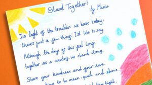 Tidak bisa dihindari, situasi pandemi memang banyak membuat beberapa orang merasa terpuruk. Di beberapa negara, anak-anak diajak untuk ikut berpartisipasi membangkitkan semangat orang lain melalui puisi. Salah satunya adalah puisi berjudul “Stand Together” yang ditulis oleh seorang anak bernama Marcie. Dengan bahasa yang sederhana khas anak kecil, puisinya menyatakan bahwa di tengah hari-hari yang sulit dan menyakitkan ini, orang-orang harus tetap harus berjuang dengan menyebarkan kebaikan.
