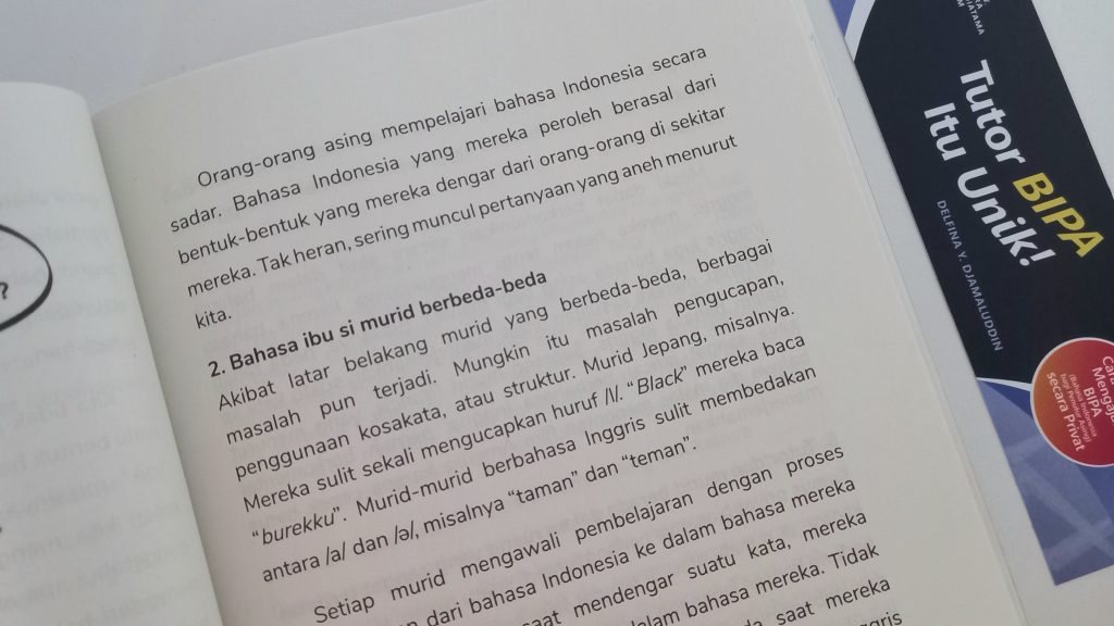 Tutor BIPA adalah profesi asing, bagian ini menjadi bagian yang tidak kalah unik. Delfina membahasnya pada bab awal. Banyak masyarakat yang belum tahu bahwa ada profesi yang mengajarkan bahasa Indonesia untuk orang asing. Padahal, letak Indonesia yang strategis serta tempat-tempat wisata dan budaya yang memesona membuat warga dunia ingin mengunjungi negara kita. Tentu mereka juga ingin mempelajari bahasa kita sehingga dibutuhkan tutor dengan kemampuan yang berkualitas.